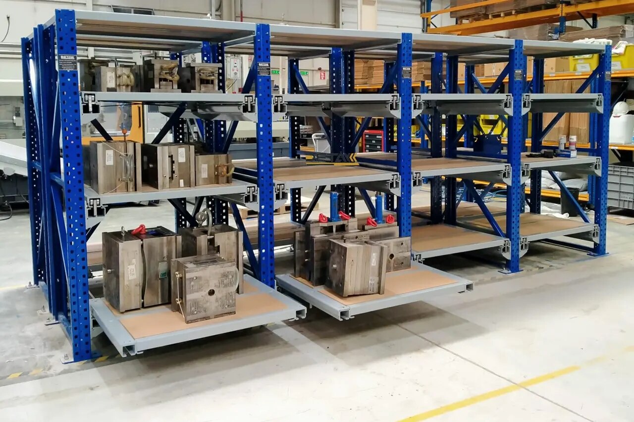 Die and Mould racks are very convenient to use die / mould storage devices with a built in lifting and lowering chain hoist. The drawers are sturdy and can be pulled out and pushed back with the load. In order to remove a die or mold from the rack simply put out the drawer on which the mold is placed. Pull the monorail trolley and the chain hoist above the mold. Attach the hook of the hoist to the mold. Lift the mold with the chain hoist about 2 inches above the drawer. Push back the drawer into the rack and lower the mold to the ground or to a pallet lying in front of the rack. The mold can now be moved to the machine with a pallet truck.